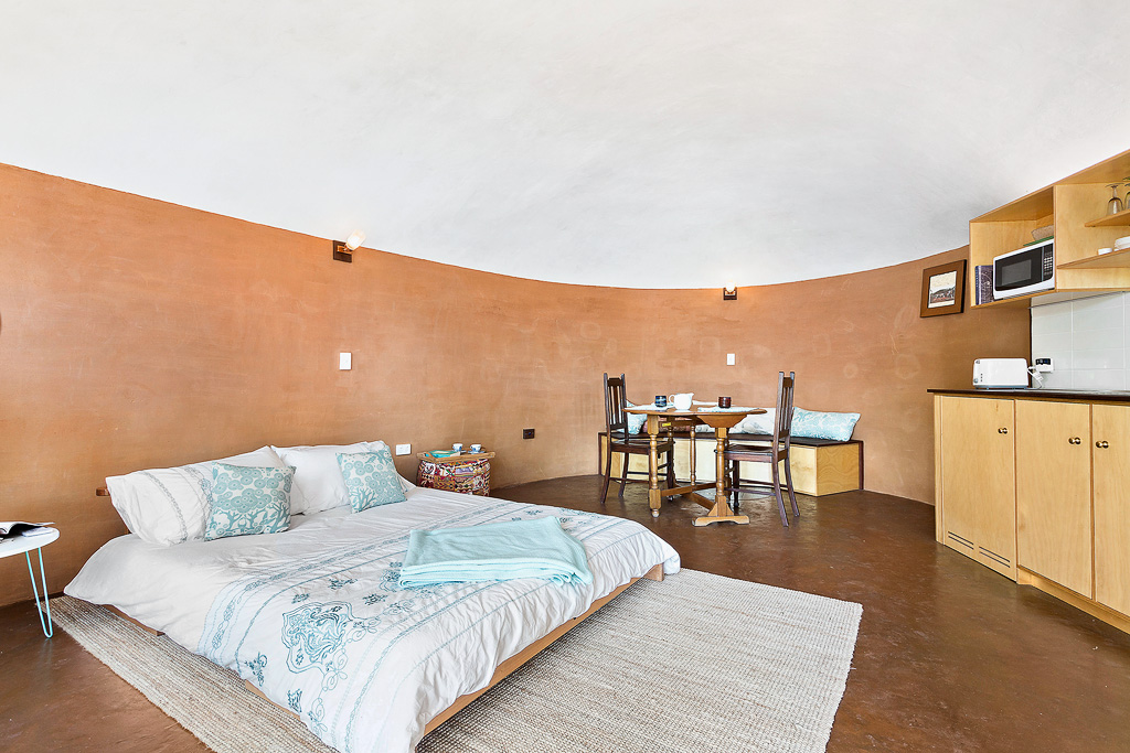 Comprising natural and upcycled resources, Dr. Freney says it showcases how waste materials can be transformed into a comfortable and contemporary self-sustaining oasis. “The walls are constructed from old tyres packed with earth, which keeps the house cool in summer and warm in winter without the need for expensive heating and cooling systems,” he says. “In total there were about 800 tyres used to build the Earthship.”
