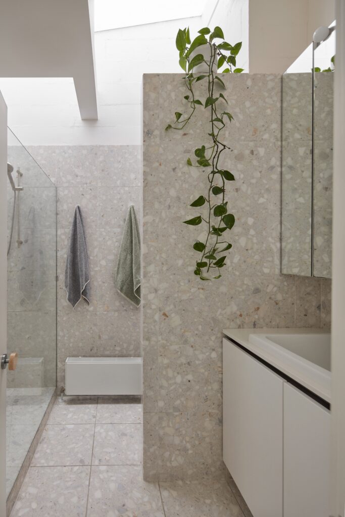 One striking feature of the Haines Street renovation is the blend of privacy and openness. The parent’s bedroom, in the top floor extension, basks in light from the south, while the adjoining bathroom, a few steps up due to the split levels, opens onto a sun-drenched rooftop deck, integrating the home with the outdoors.