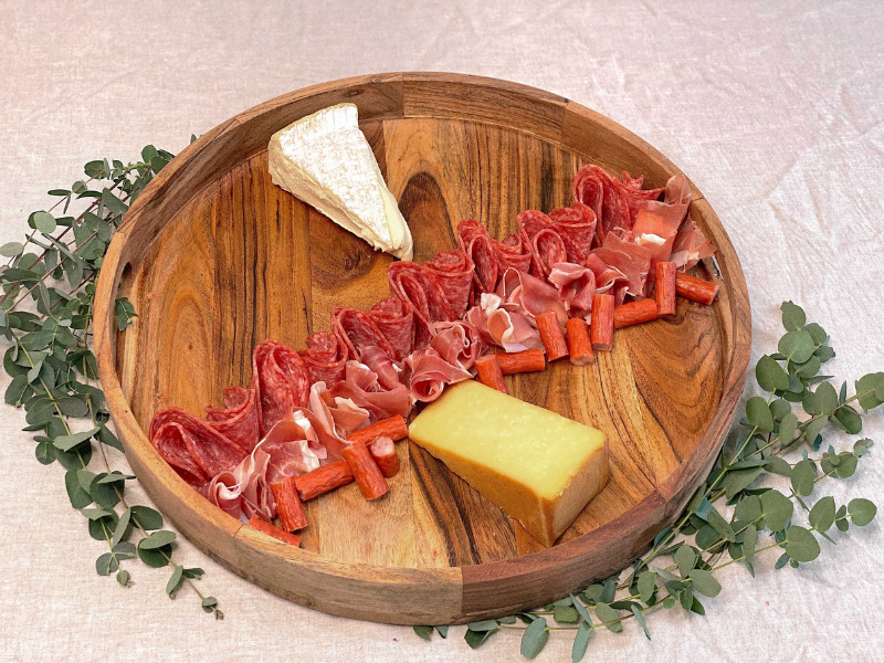 When it comes to cheese, it’s best to opt for a mixture of textures with at least one soft and one hard cheese. There are endless options and combinations, but Brie, Camembert and Fromager d’Affinois are our go-tos when it comes to soft cheese. Gouda, aged cheddar and Gruyère are always a hit down the hard end of the spectrum.