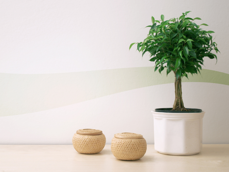 One of the few trees that grow well indoors, this leafy tree helps to keep the air inside moist and cool. Opt for a tall trunk with a bushy top that could serve as a little forest canopy for other plants below or around it.